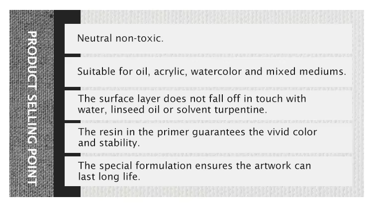 ● Hosszú ideig tartósság:Ez a rajzoláshoz létrehozott művészet. A kemencével szárított fenyőkeret ellenáll a 30% -70% -os páratartalomban. A dupla alapú felületek olajfestéket, akrilfestéket és vegyes tápközeget fogadnak el vérzés nélkül.
